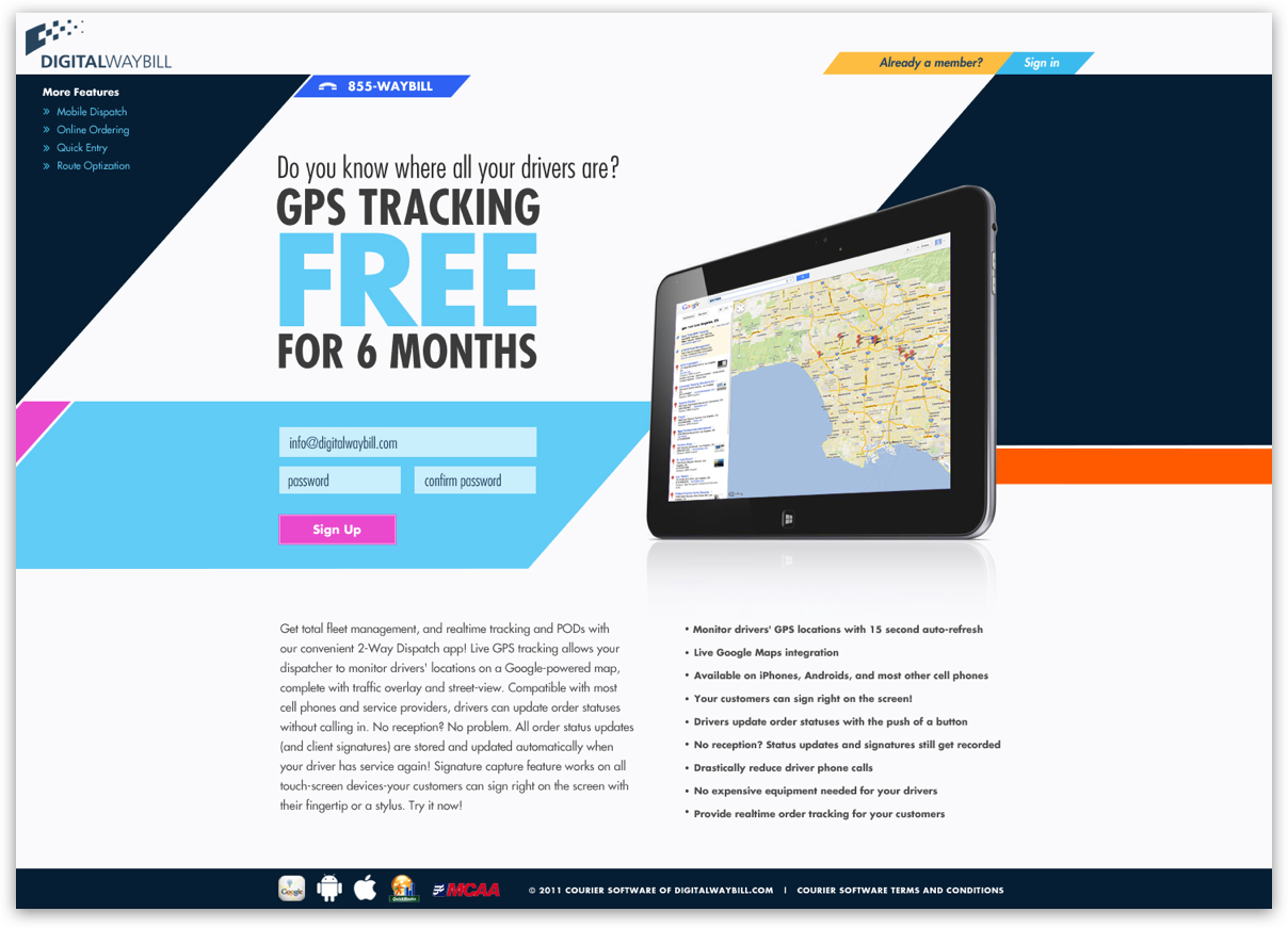 Digital Waybill is a courier software that enables customers, dispatchers,and drivers communicate up to the minute of when a package is to be delivered. They needed a brand refresh that included a new look and feel to their UI of their mobile and desktop apps, a new website, and new packaging for onboarding clients.