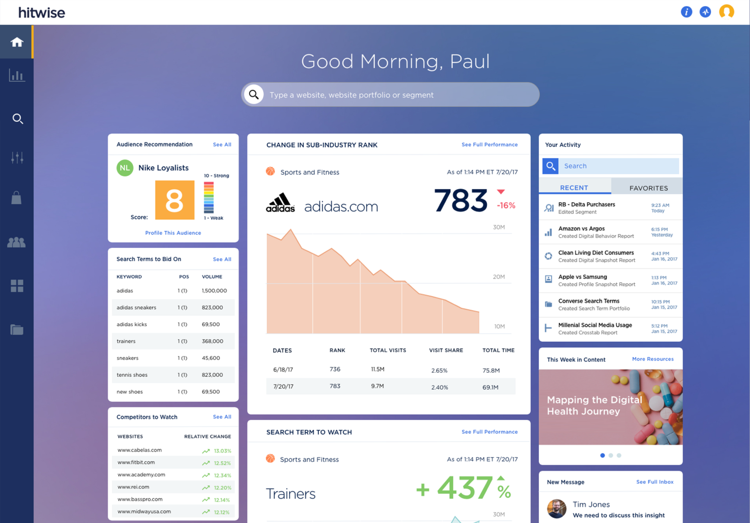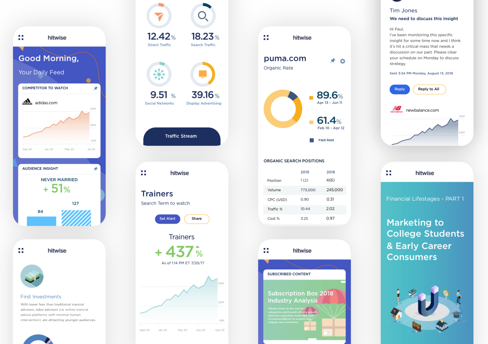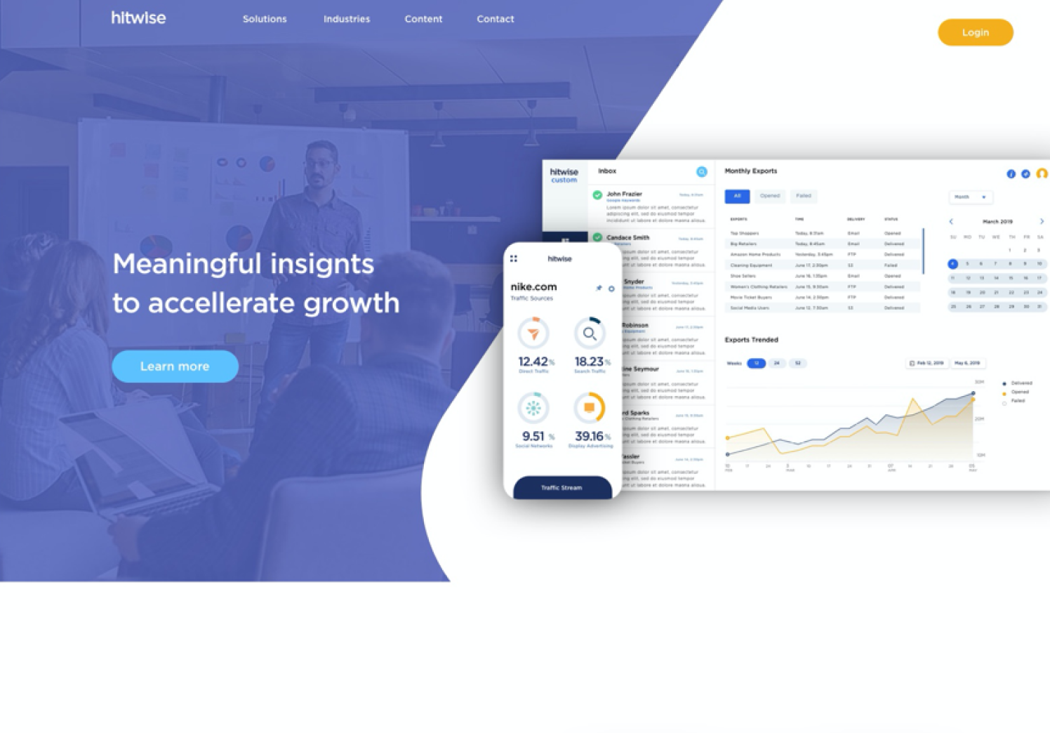 Hitwise has a large amount of user data and needs a platform that can deliver insights to its customers. Users need to be able to keep track of their performance, their competitor's performance and share those insights with members of their team.